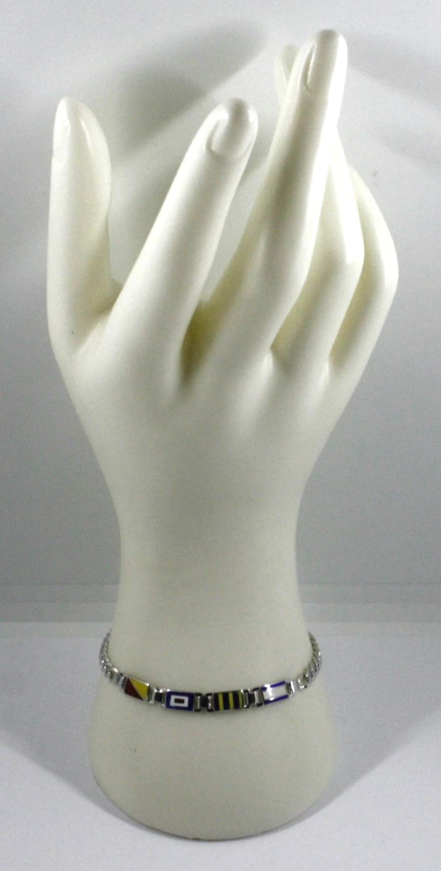 Bracciale Arcadia in argento 925 con bandiere nautiche smaltate a fuoco, spessore 5.5 mm, maglia groumette, lunghezza 19-20.5 cm, Made in Italy