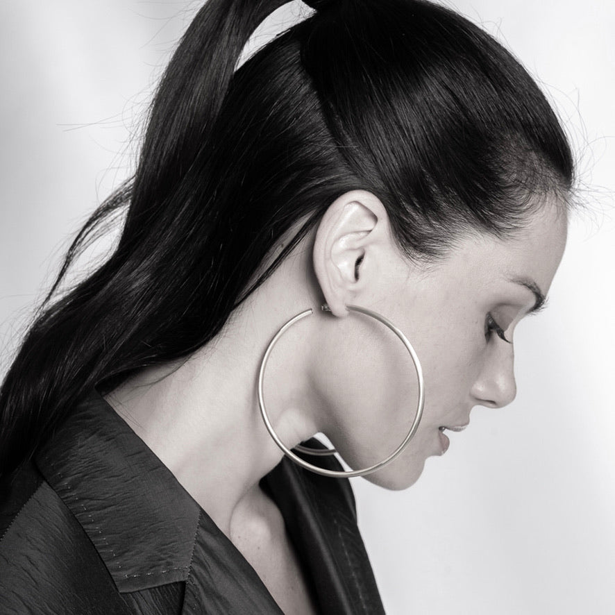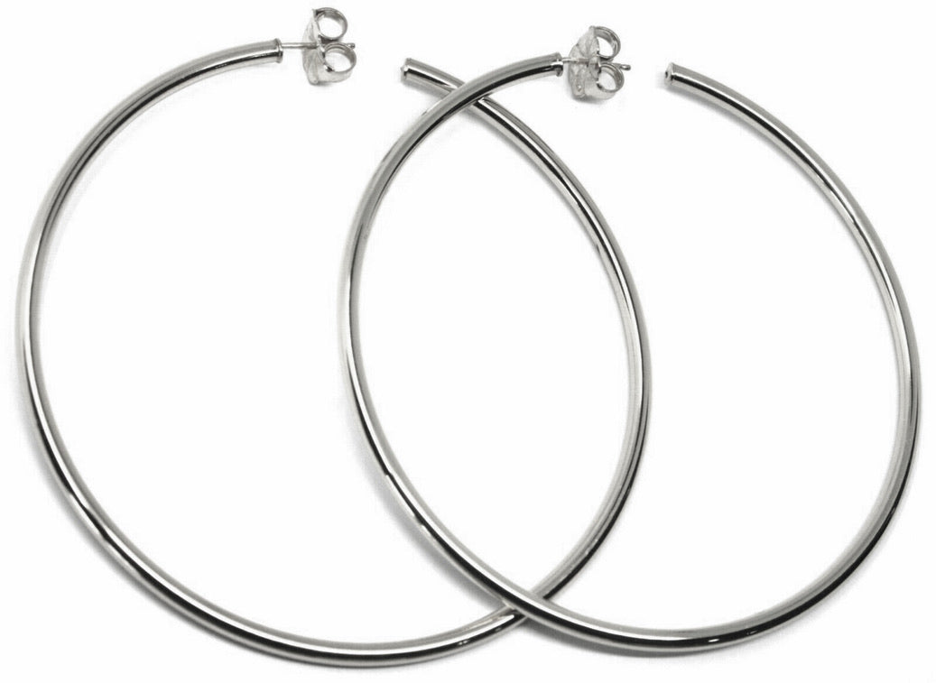 Orecchini a cerchio satinati a mano in AG 925‰ rodiato. Diametro cm 8.5, spessore 3 mm